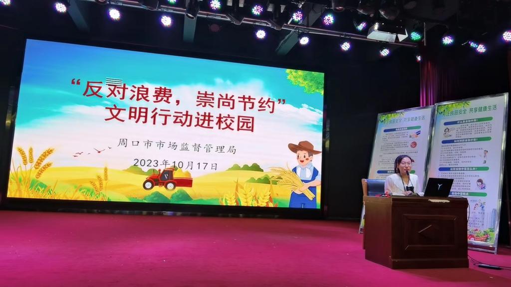 2023年10月17日上午,周口市市场监督管理局经开分局联合后勤处在我校开元校区学前与艺术学院演播厅举行了“反对浪费,崇尚节约”文明行动校园行活动,230余名师生参加了本次活动。